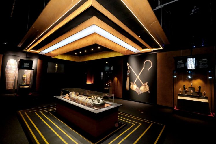 Objetos exhibidos incluyen la copa para rogativas de Tutankamón, figuras de deidades pertenecientes a su tumba, y el famoso cofre canópico dorado que contenía los órganos embalsamados del rey.